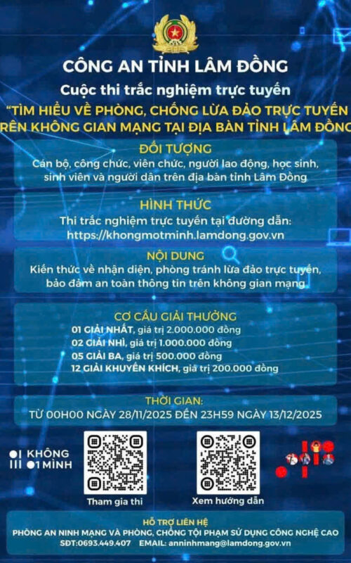 Nhằm nâng cao kiến thức nhận diện, phòng tránh lừa đảo trực tuyến và đảm bảo an toàn thông tin trong môi trường số, Công an tỉnh Lâm Đồng tổ chức cuộc thi trắc nghiệm trực tuyến dành cho cán bộ, công chức, viên chức, người lao động, học sinh – sinh viên và người dân trong tỉnh.